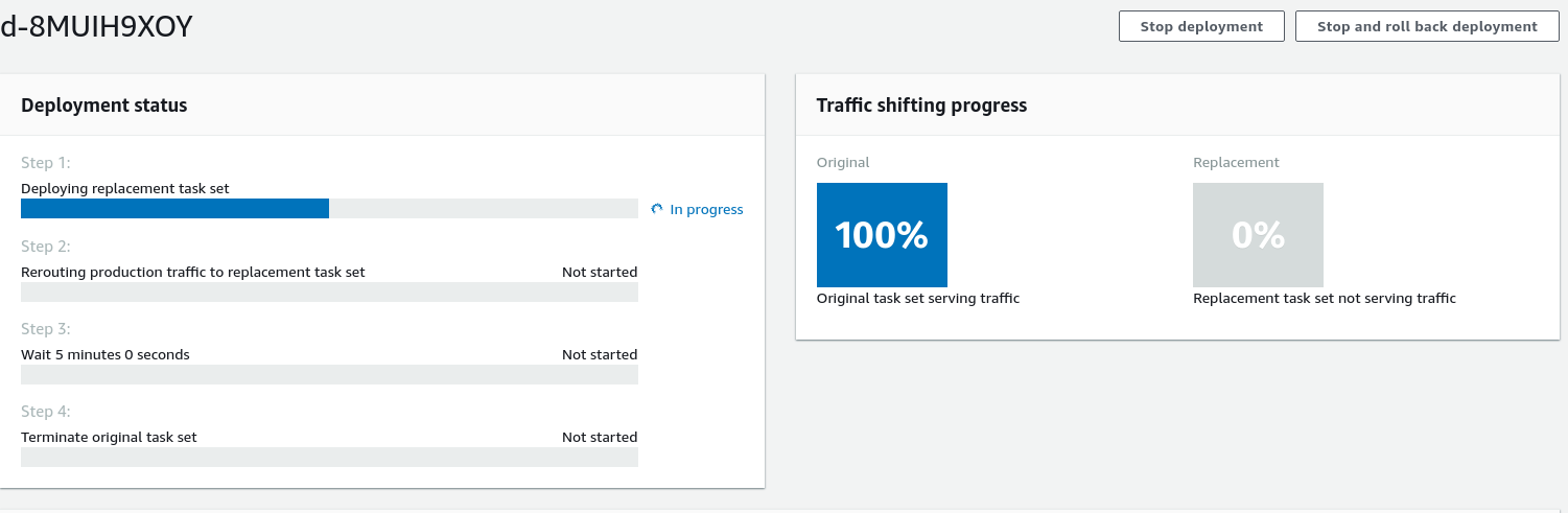 CodeDeploy also has a very good overview of the state of the Blue/Green Deployment, where you can see how much traffic to which target group is forwarded at the moment: