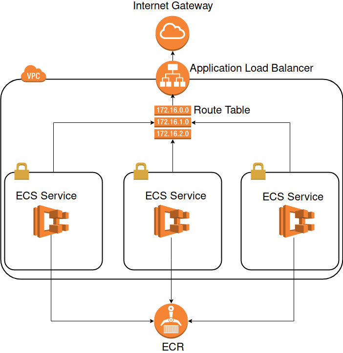 As you can see we will build up a VPC with three subnets where the ECS Services can be spawned in. The ECS Services have access to the ECR to pull images. In front of our network is the load balancer, which redirects the traffic to the services.