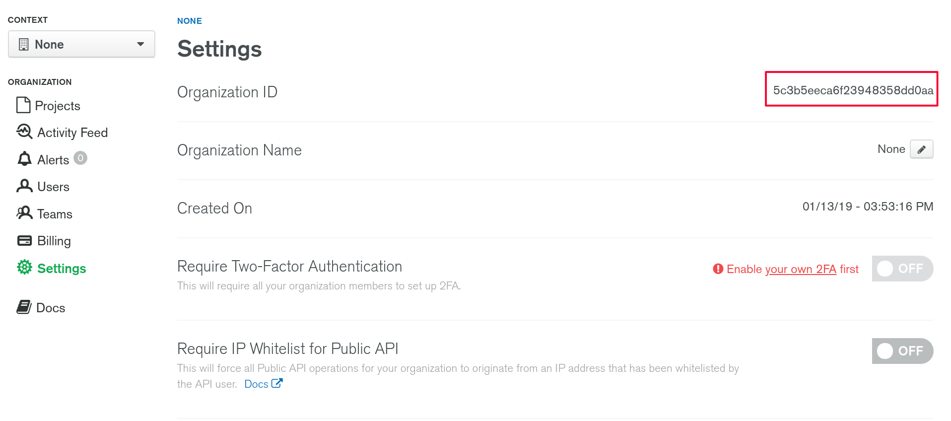 }To create a project resource we need an organisation id, which can be found in the settings tab: