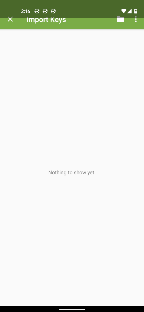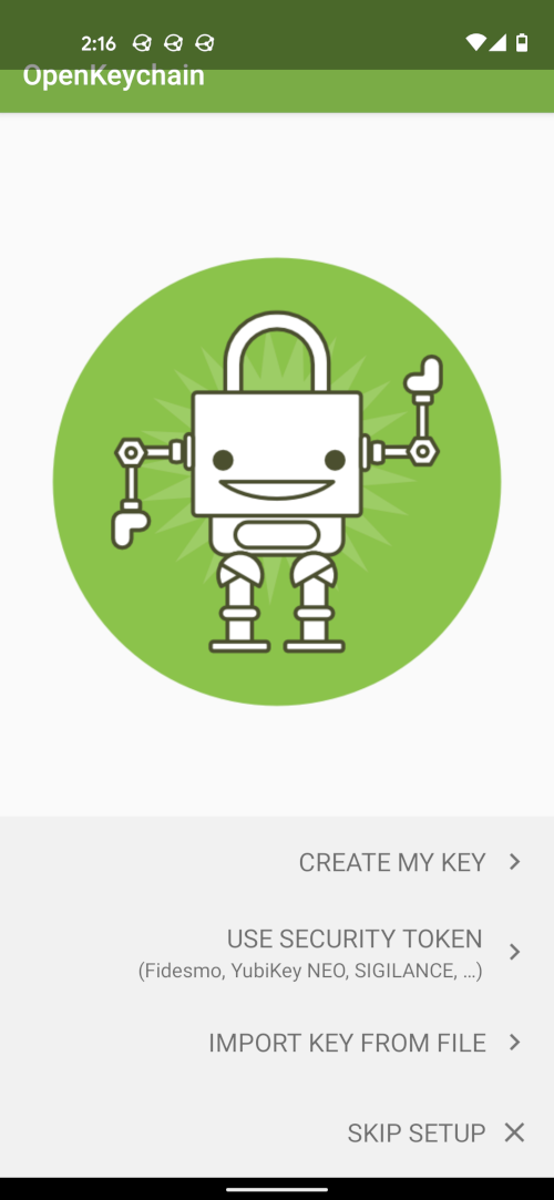 Afterwards we need an app, which can deal with gpg keys. The app I use for this is called OpenKeychain. Download it from F-Droid or the Play Store and open it. You should see the following welcome screen: