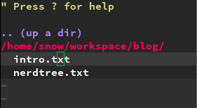With the last part of the configuration, we already stepped into the usage. But what are we able to do, if we called :NERDTreeFocus? The short answer is: pretty much everything you can do with a tree view in Sublime and other editors/IDEs. In this tutorial I only go through the functions I use mostly, but there are plenty more helpful shortcuts and functionalities. For a full reference you can always type in ? while in NERDTree and you get the full list of shortcuts. Press ? again to come back to the tree view. # Navigation Ok, lets start of easy. j and k are also used for navigating up and down like in any other buffer. To jump to the parent directory, you can press p and if you want to go to your root directory you press P. To open a directory press o. This will show all files and sub directories. To close the directory, simply press o again. # Setting the current node and bookmark The number one reason we want to use NERDTree is an overview of our current project or set of files, which is always a sub node in our file system. At the moment I’m navigating through the console to the root directory of my project and open vim there. But there is also a NERDTree way of doing this. You navigate to the root directory of your project in NERDTRee and press cd afterwards. This means “change directory” and it doesn’t have any visual effect. But now every command you type into command-line mode is relative to your chosen root directory and not to the system root. Next thing you may want to do is to only show this directory and hide the rest of your file system. By pressing C you set the underlying directory as the top most visible node. Every time you want to work on your project you need to navigate there. This gets very exhaustive, but NERDTree has a neat feature called bookmarks. You can bookmark directories and files and you are instantly able to open them from a bookmarks list, without navigating there first. To bookmark a node, like our project root, we type in :Bookmark, while NERDTree is focused and the project root is chosen. To open our bookmarks we can press B and now we can type cd, C and o on the chosen bookmark and we are in our project without navigating there first.