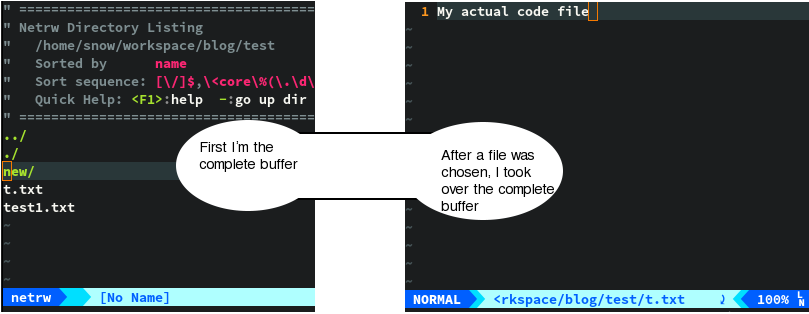 Of course you can take whatever binding you are comfortable with. Now NERDTree should be opened in the buffer you are currently in and if you open a file, NERDTree will hide and your chosen file appears instead. You can experiment with this setup now. If you feel more comfortable with this setup, like me, you can also do the switch to netrw. You need to learn some new shortcuts for netrw, but they are pretty intuitive in my opinion. If you don’t want to go that way, you can stay with this NERDTree approach aswell and if you don’t feel comfortable with the split explorer approach at all you can keep using NERDTree as it is. If you decided for netrw, I will get you going in the upcoming couple of paragraphs.
